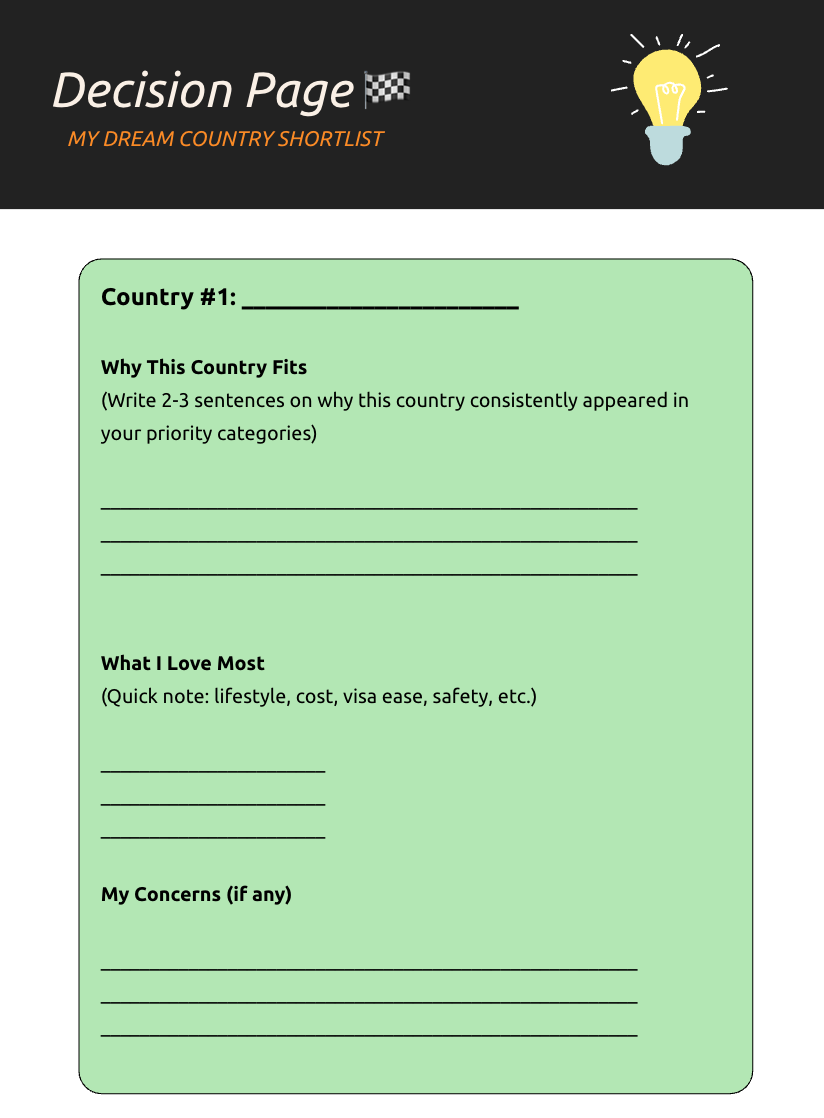 By the end, you have a shortlist of countries that match your life. Not a list of maybes, but a real shortlist you can act on.