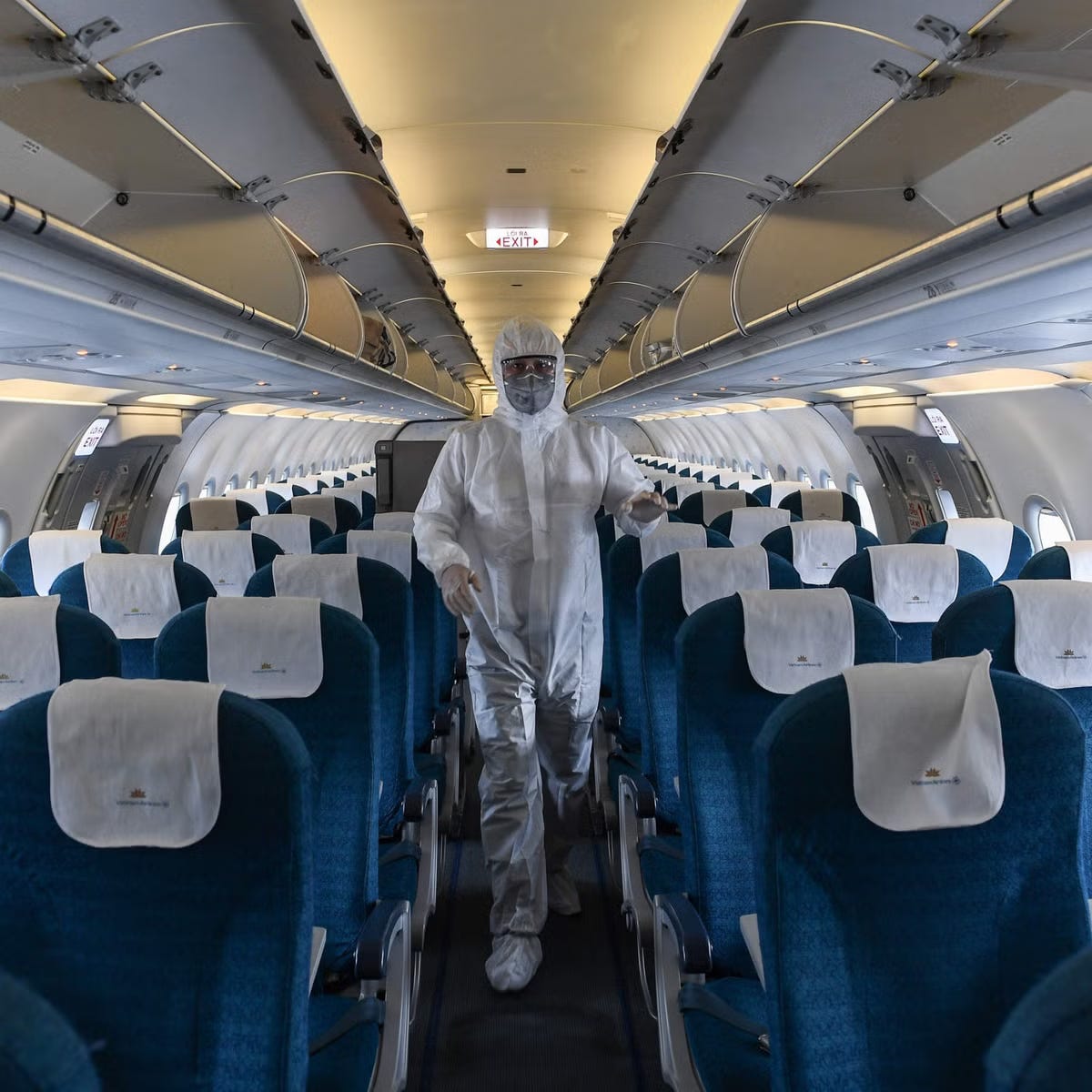 Three people on the plane, then just silence, masks, and fluorescent lighting.